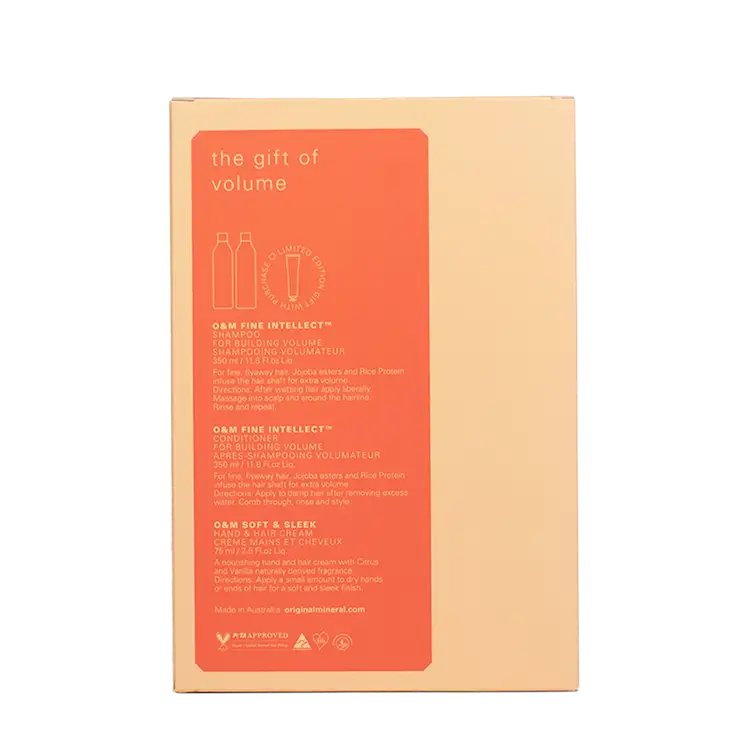Ge ditt hår en fantastisk volymboost med O&M The Gift of Volume – ett exklusivt limited edition-set med tre favoriter designade för fint och flygigt hår. Med hjälp av jojobaestrar, risprotein och naturliga växtextrakt stärks hårstrået och får extra fyllighet utan att tyngas ner.